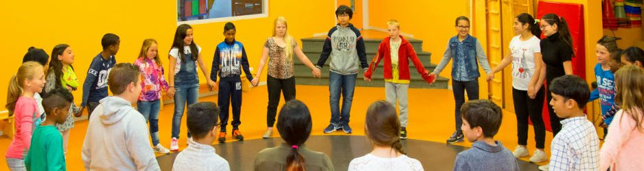Groepsdynamica in de klas - Een groep kinderen die in een cirkel staat en de dynamiek in de klas laat zien. School en Veiligheid