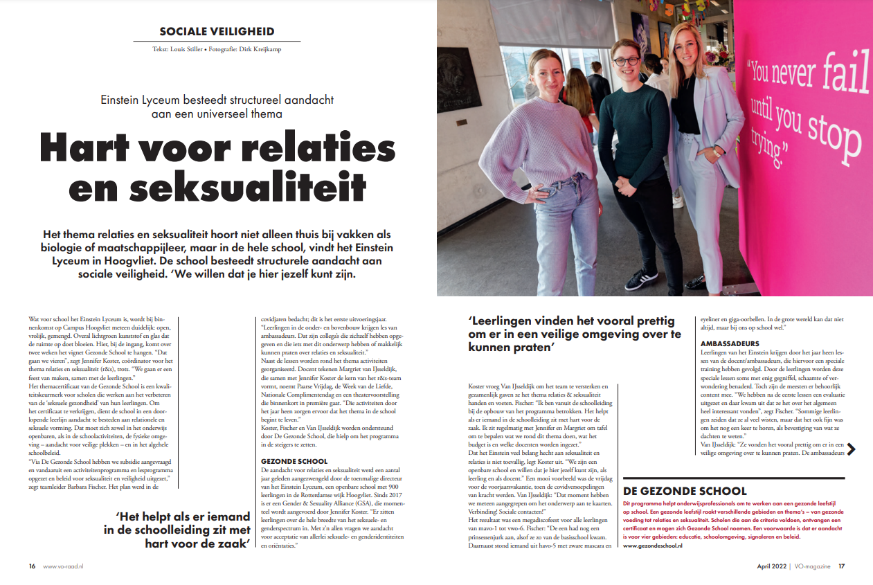 Een tijdschrift over seksuele integriteit, met praktijkverhalen en een foto van een vrouw en twee mannen. School en Veiligheid