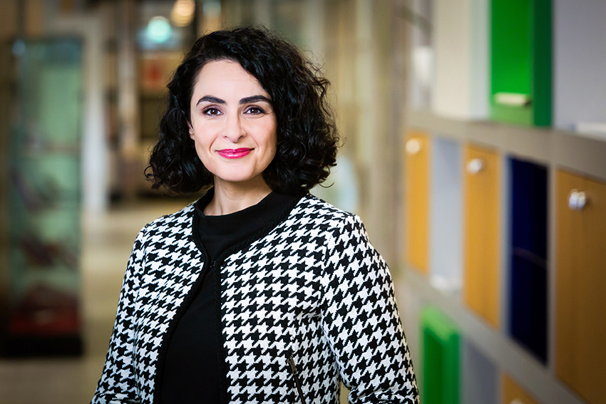 Een vrouw in een zwart-wit pied-de-poule jasje in een gang tijdens de Onderwijsconferentie. School en Veiligheid