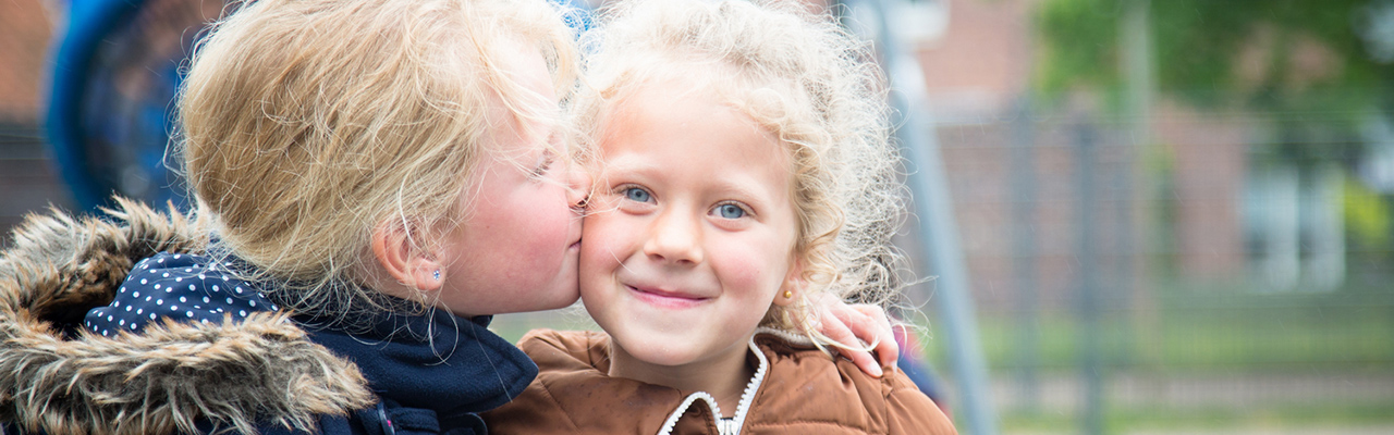 Twee kleine meisjes kussen elkaar liefdevol op de wang en tonen onschuldige uitingen van vriendschap en kameraadschap. School en Veiligheid