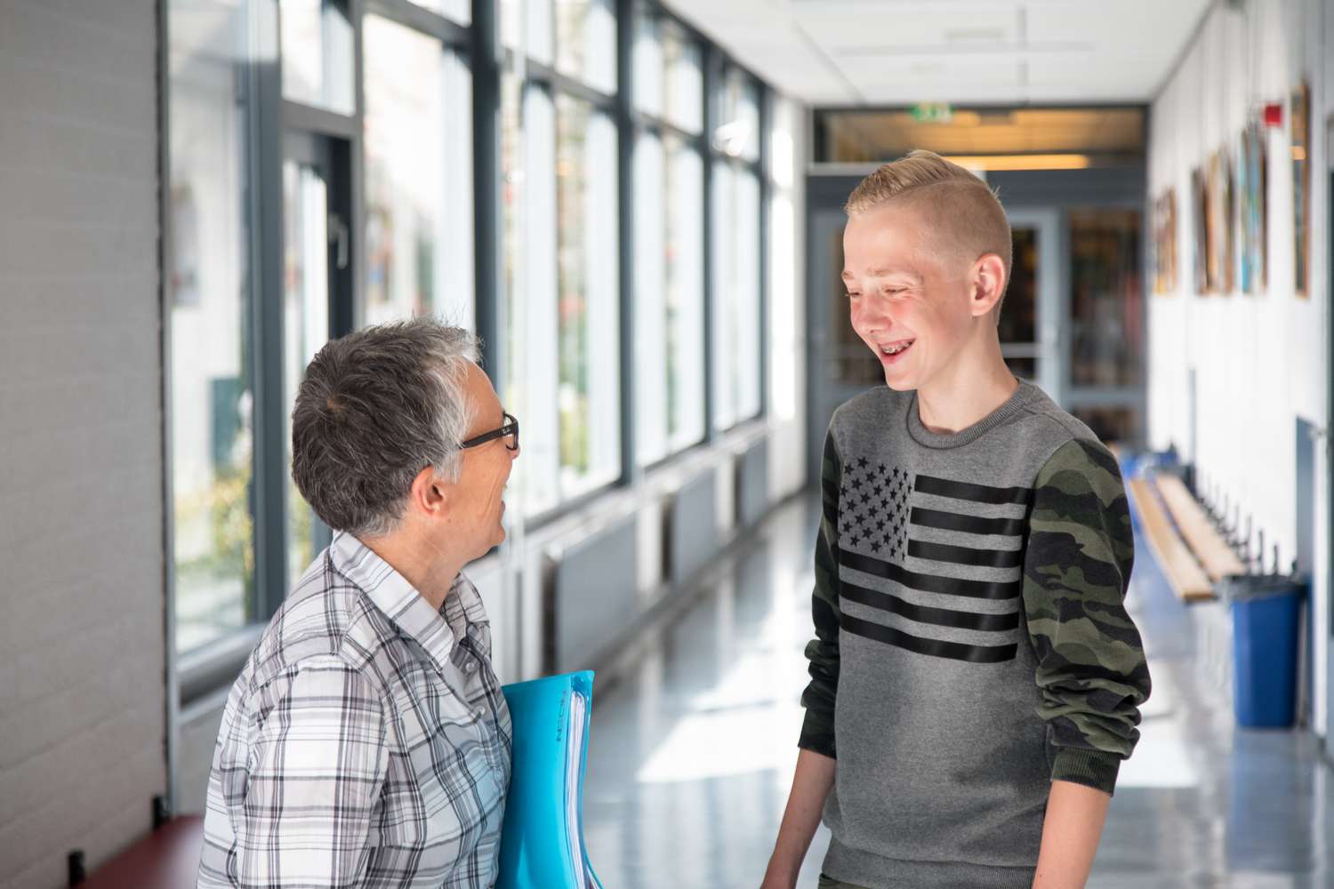 Een jonge jongen is bezig met vertrouwenswerk terwijl hij met een oudere man praat in een gang op het voortgezet onderwijs. School en Veiligheid
